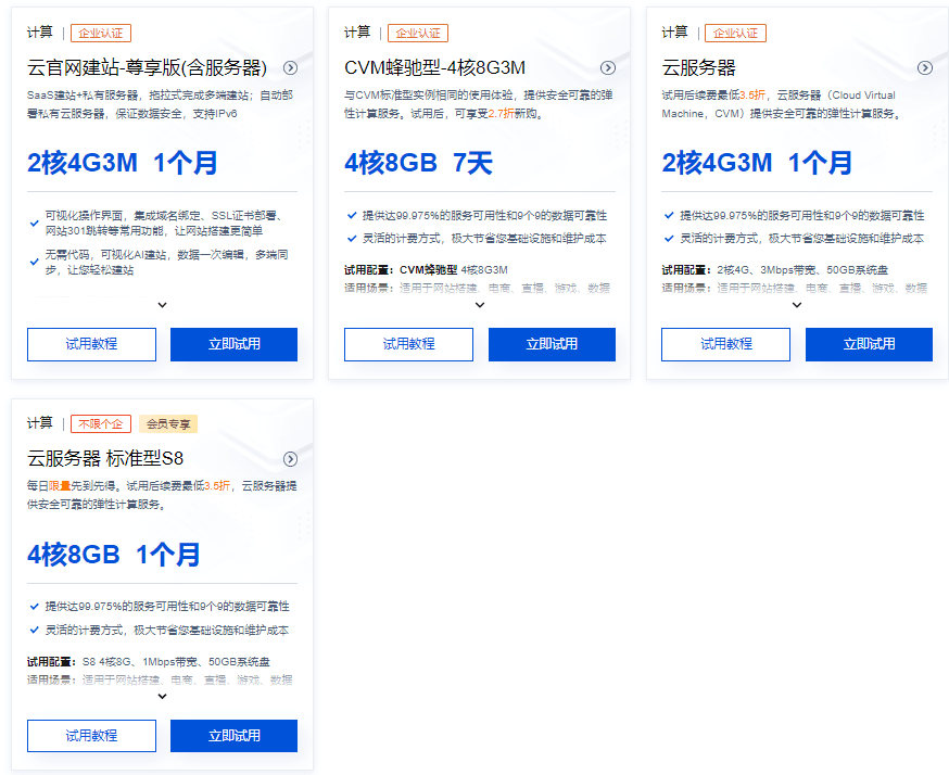 腾讯云免费企业云服务器针对企业用户提供多种试用产品,包括2核4G3M、4核8GB等规格,最长可以试用一个月。